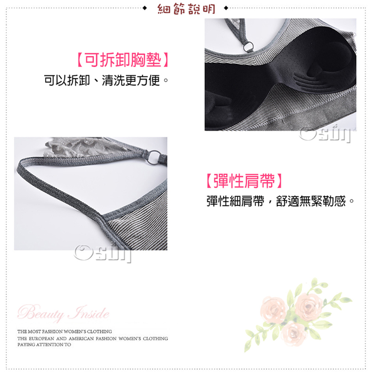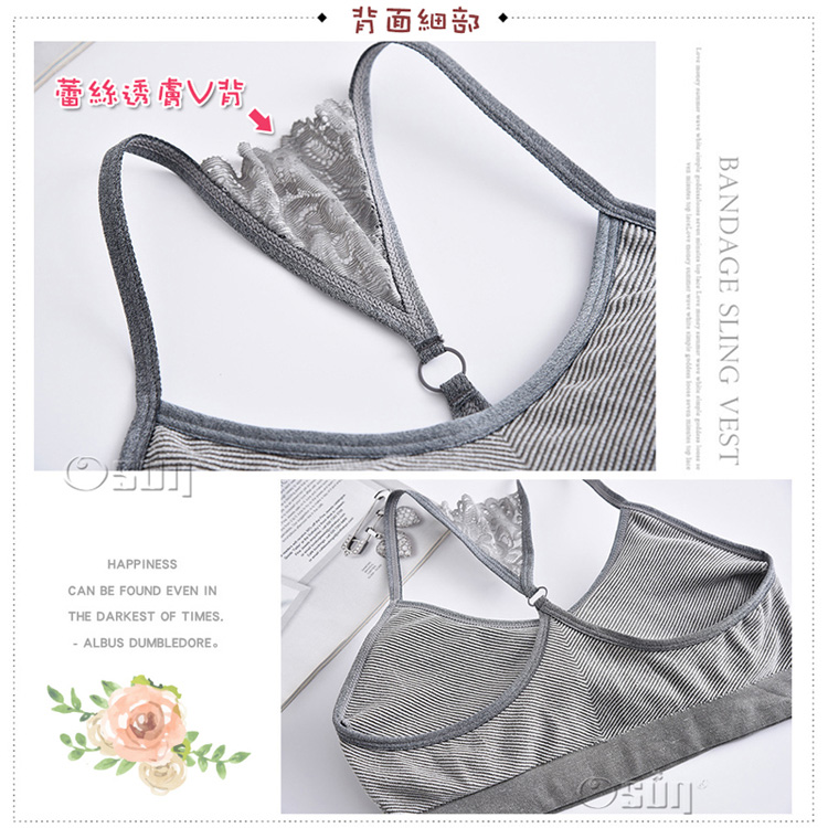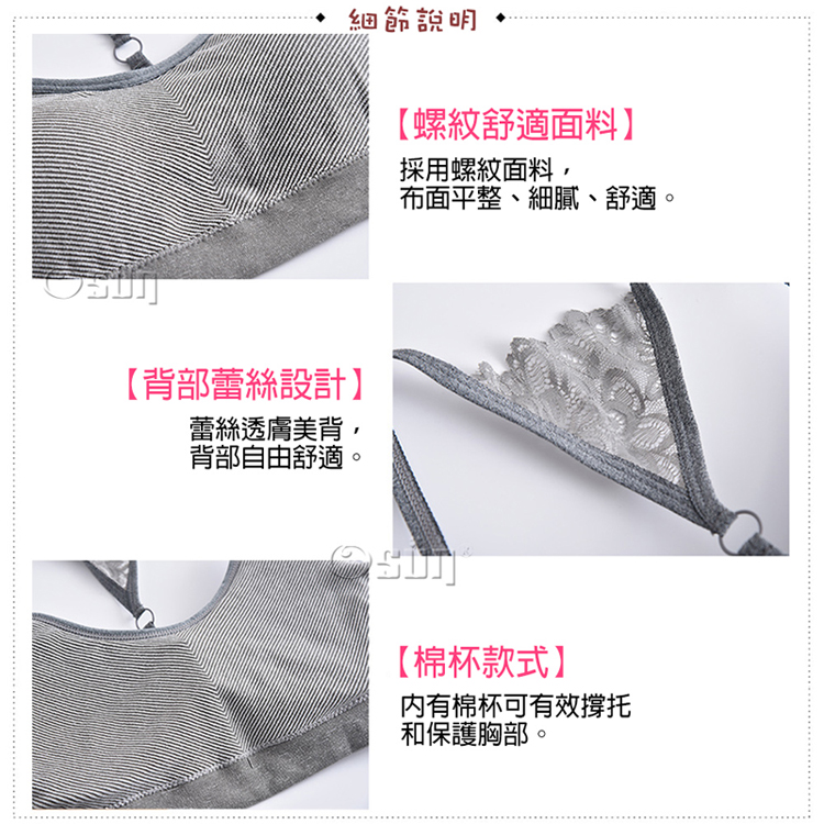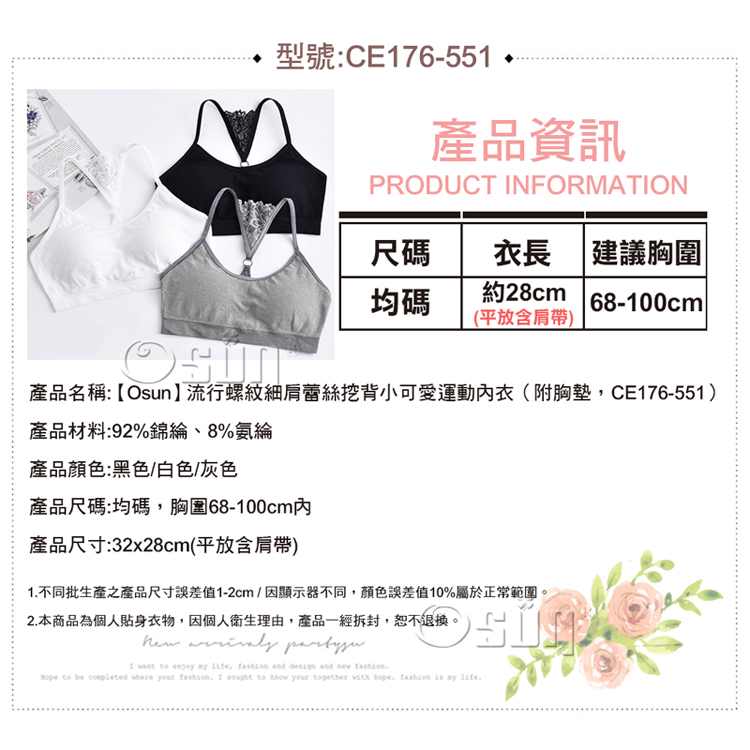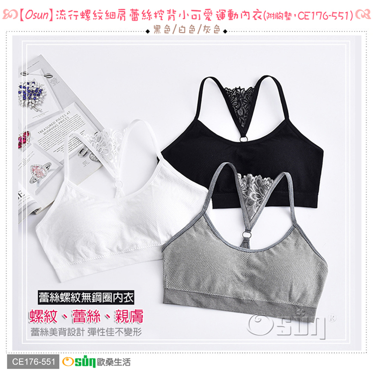 產品名稱:【Osun】流行螺紋細肩蕾絲挖背小可愛運動內衣(附胸墊,CE176-551)產品型號:CE176-551