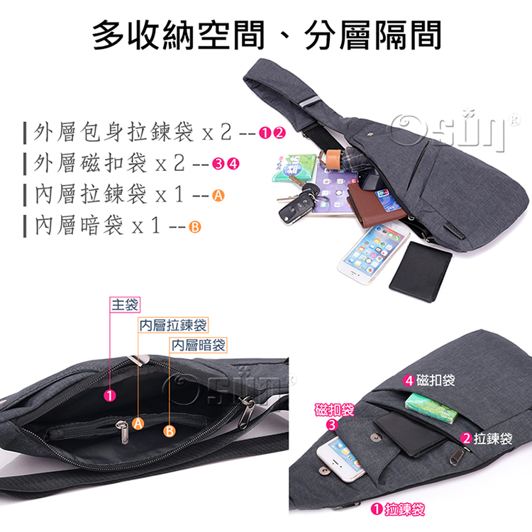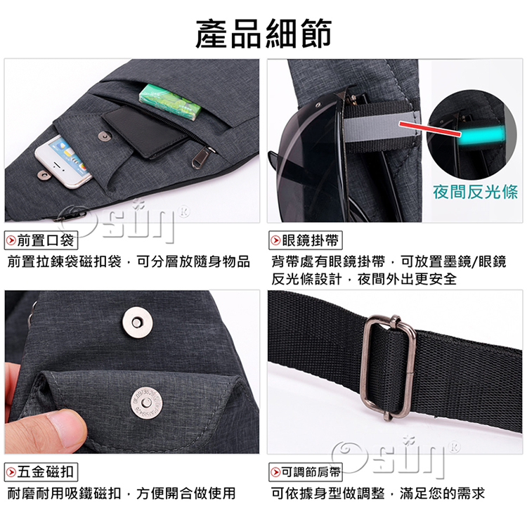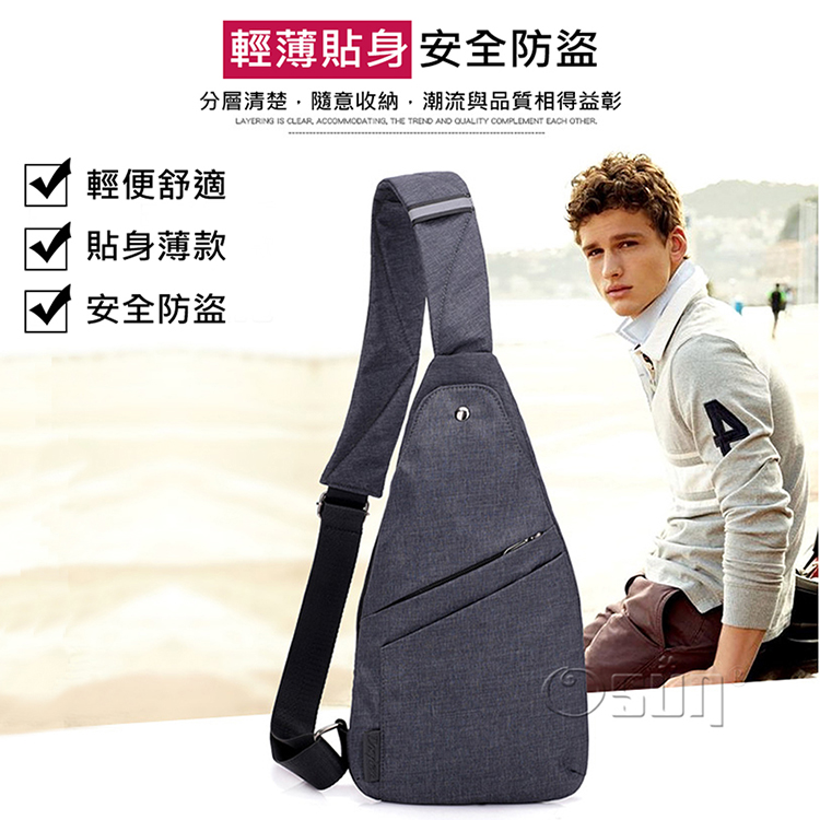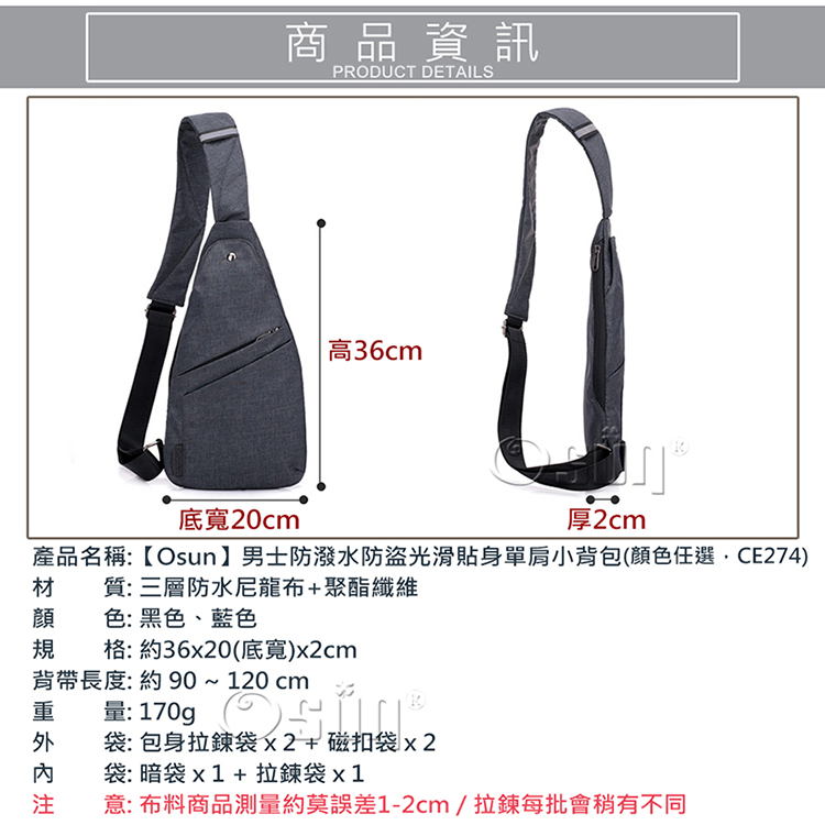 產品名稱:【Osun】男士防潑水防盜光滑貼身單肩小背包(顏色任選,CE274)