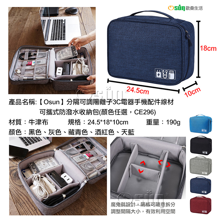 產品名稱:【Osun】分隔可調陽離子3C電器手機配件線材可攜式防潑水收納包(顏色任選,CE296)