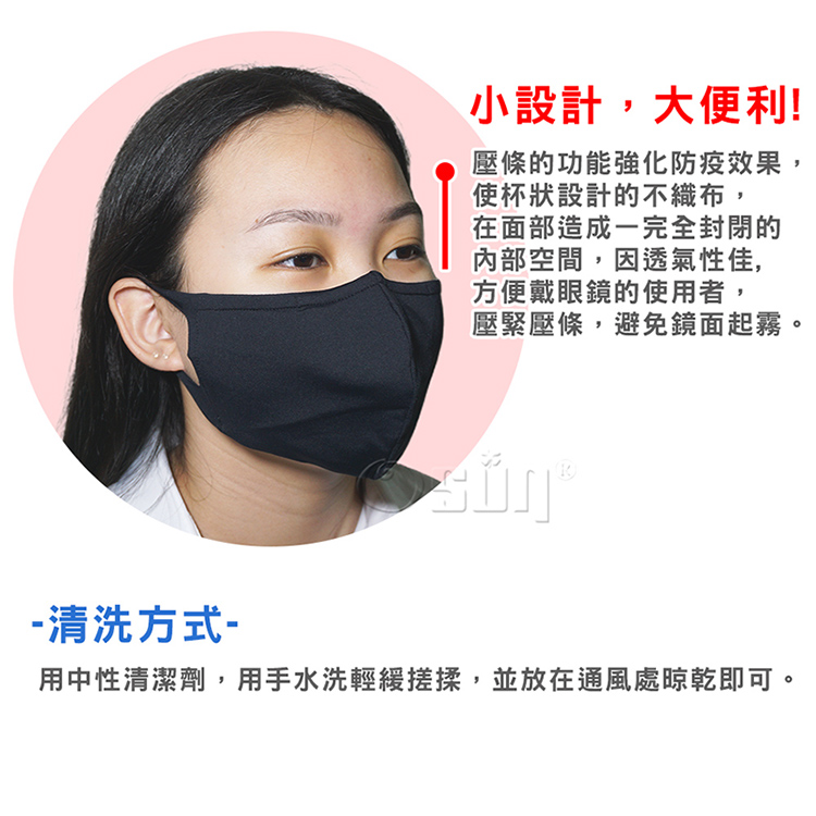 壓條的功能強化防疫效果,使杯狀設計的不織布,在面部造成一完全封閉的內部空間,因透氣性佳, 方便戴眼鏡的使用者,壓緊壓條,避免鏡面起霧。小設計,大便利。