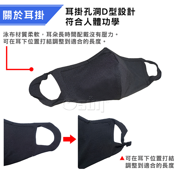 耳掛孔洞D型設計,符合人體功學,泳布材質柔軟,耳朵長時間配戴沒有壓力,舒適。可隨個人需求,在耳下位置打小結調整到自已最適合的長度。