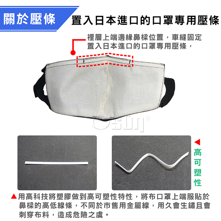 上端邊緣鼻樑位置,置入日本進口的口罩專用壓條,用高科技將塑膠做到高可塑性特性,此壓條能將此布口罩上端服貼於鼻樑的高低線條,不同於市售用金屬線,用久會生鏽且有刺穿布料,造成危險之虞。