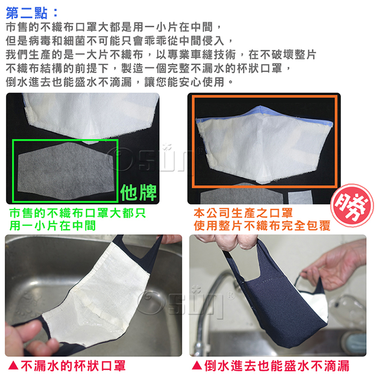 第二市售的不織布口罩大都是用一小片在中間,但是病毒和細菌不可能只會乖乖從中間侵入,我們生產的是一大片不織布,靠良好的專業車縫技術,在不破壞整片不織布結構的前提下,用心的製造一個完整,不漏水的杯狀口罩,倒水進去也能盛水不滴漏,讓您能安心使用,本產品有實驗證明吸起紙片的靜電功能,與拋棄式醫療級品罩的防疫效果一樣。