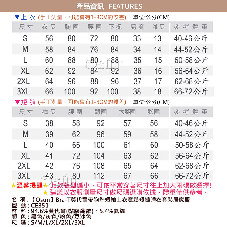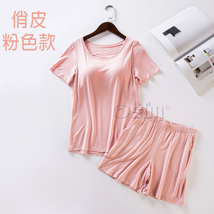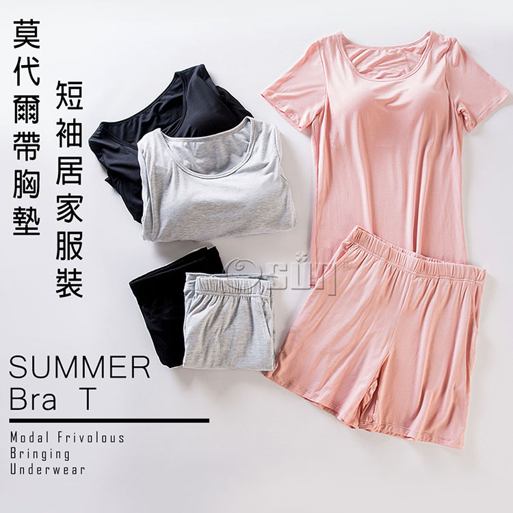 產品名稱:【Osun】Bra-T莫代爾帶胸墊短袖上衣寬鬆短褲睡衣套裝居家服