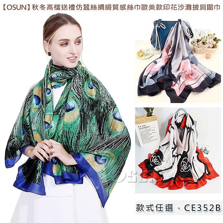 【Osun】秋冬高檔送禮仿蠶絲綢緞質感絲巾歐美款印花沙灘披肩圍巾 (款式任選,CE352B)