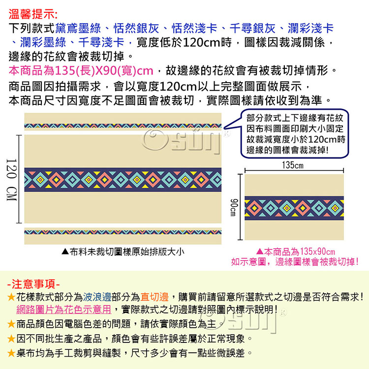 本商品為135(長)X90(寬)cm,故邊緣的花紋會有被裁切掉情形。