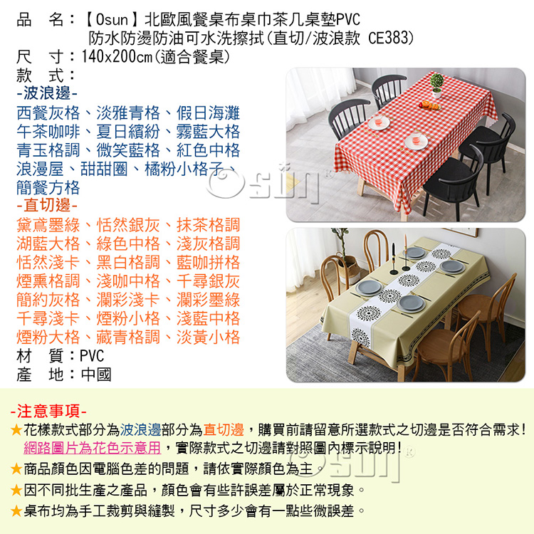 品名:【Osun】北歐風餐桌布桌巾茶几桌墊PVC防水防燙防油可水洗擦拭140x200cm (多款任選-直切/波浪款 CE383)