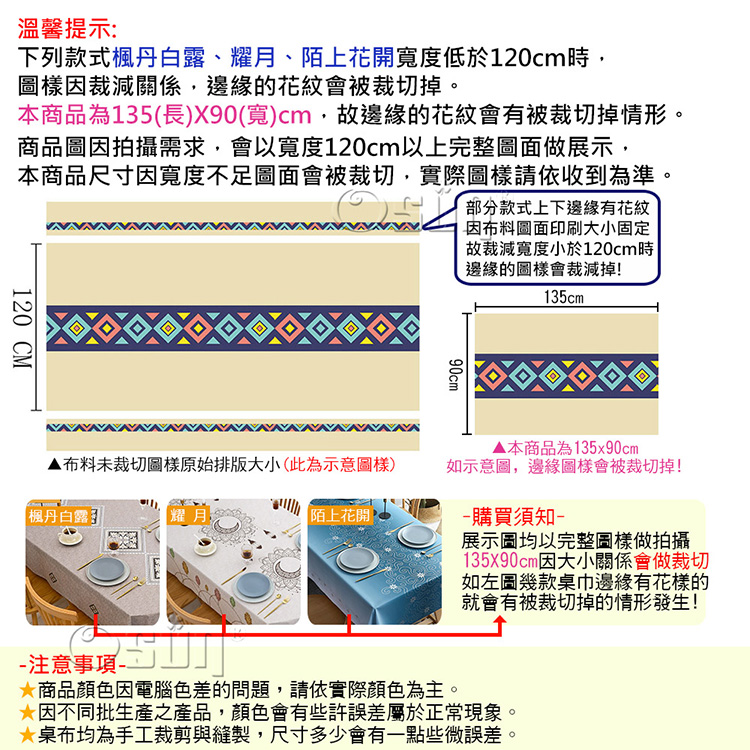 本商品為135(長)X90(寬)cm,故邊緣的花紋會有被裁切掉情形。