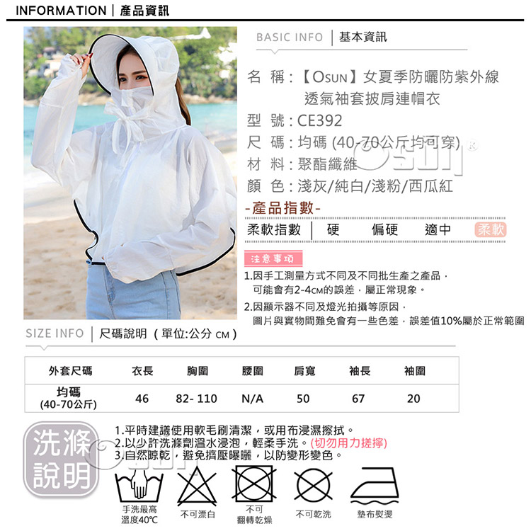 產品名稱:【Osun】女夏季防曬防紫外線透氣袖套披肩連帽衣(多款任選,CE392)