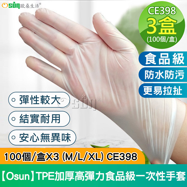 品名:【Osun】TPE加厚高彈力食品級一次性抽取式塑膠白色透明手套100個/盒X3 (M/L/XL, CE398)