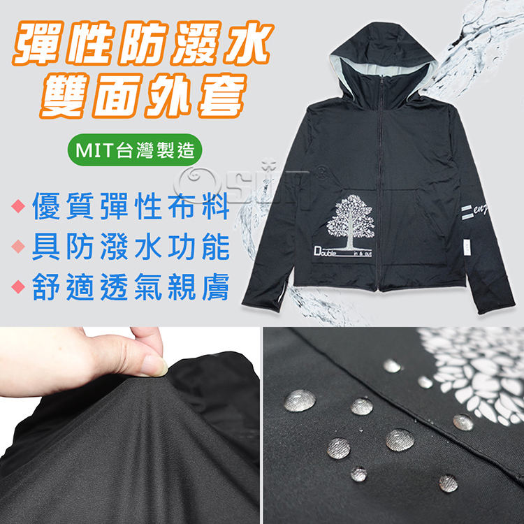 雙面採用防潑水布料製成,面料具有疏水性,水珠能聚於表面流動滑落