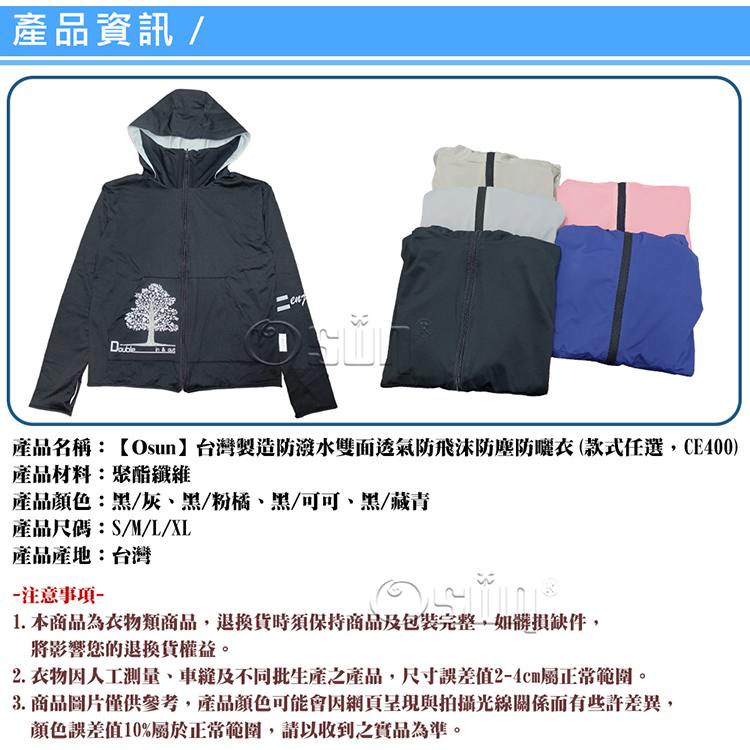 產品名稱:【Osun】台灣製造防潑水雙面透氣防飛沫防塵防曬衣(款式任選,CE400)