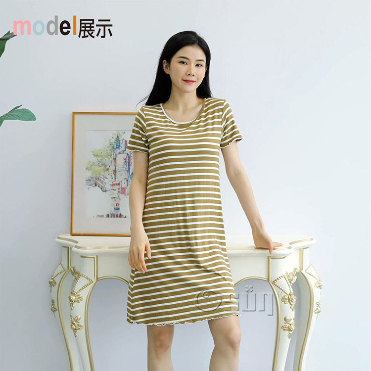 莫代爾條紋帶胸墊薄款短袖連衣裙睡衣居家休閒服,使夏季居家更能品味你的生活