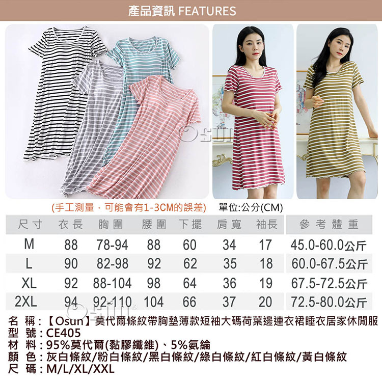 產品名稱:【Osun】莫代爾條紋帶胸墊薄款短袖大碼荷葉邊連衣裙睡衣居家休閒服(顏色任選/CE405)