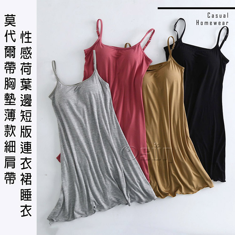 【Osun】莫代爾帶胸墊薄款細肩帶性感荷葉邊短版連衣裙睡衣 (顏色任選/CE405)