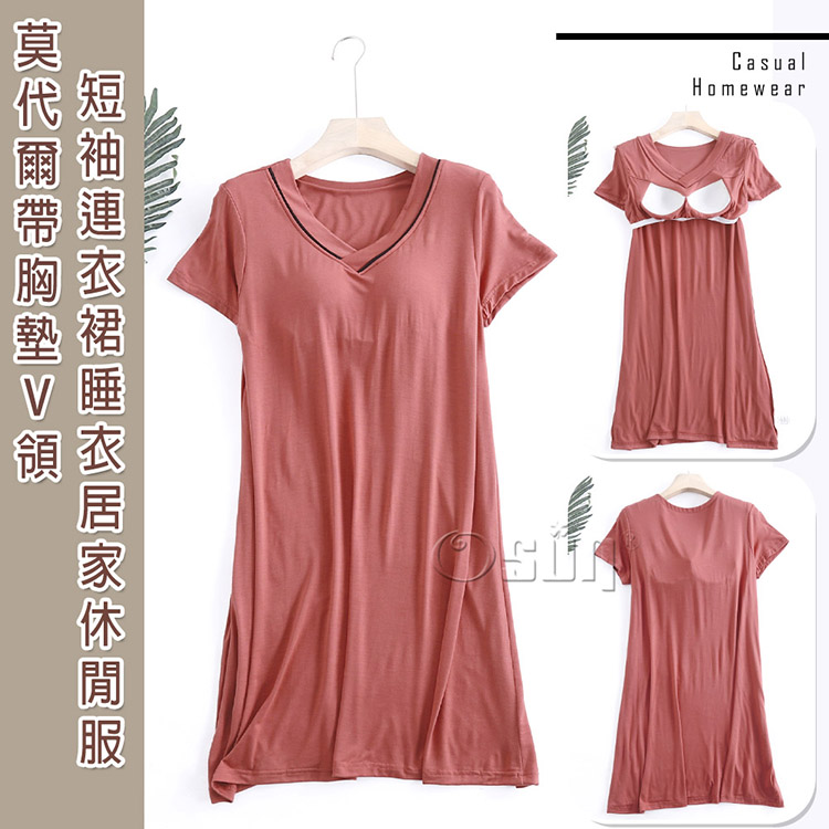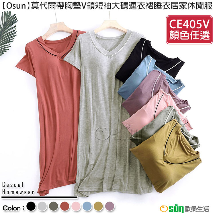 【Osun】莫代爾帶胸墊V領短袖大碼連衣裙睡衣居家休閒服(顏色任選/CE405V)