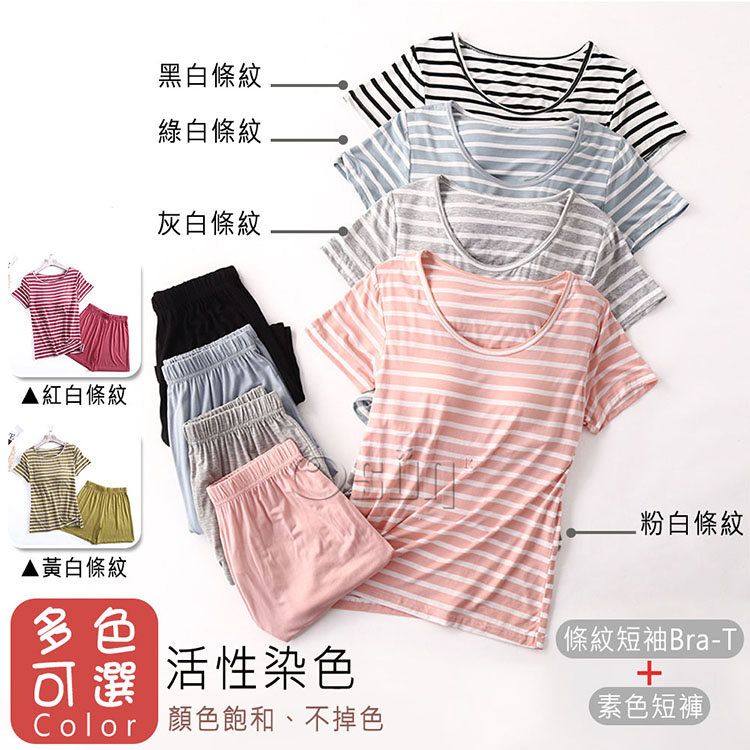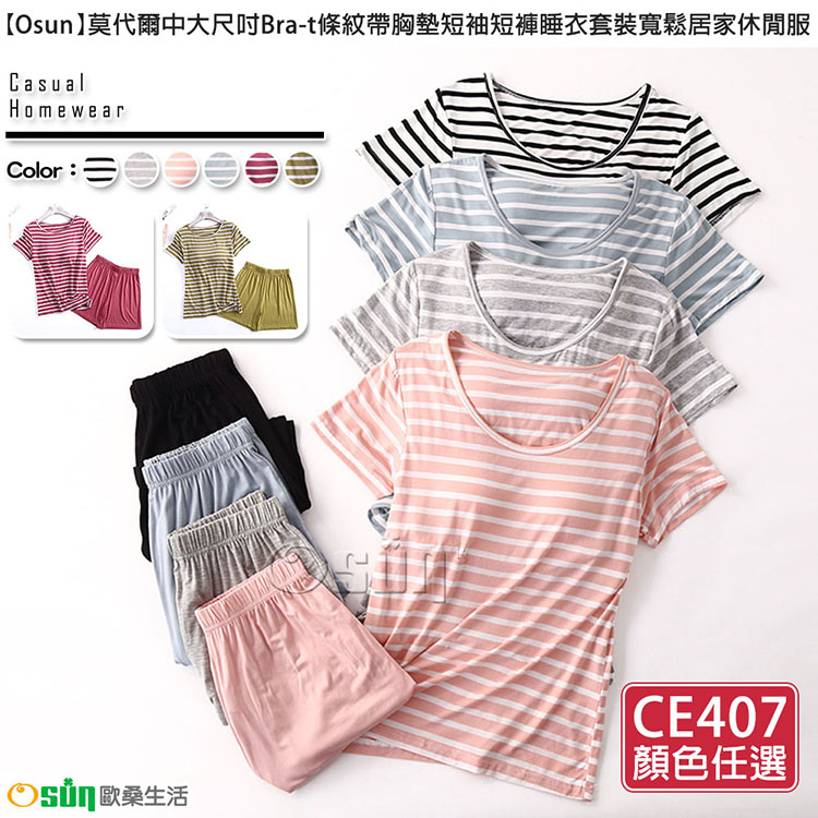 【Osun】莫代爾中大尺吋bra-t條紋帶胸墊短袖短褲睡衣套裝寬鬆居家休閒服(顏色任選/CE407)