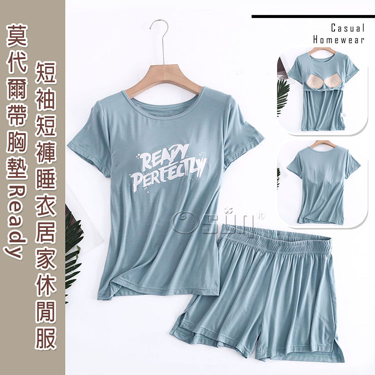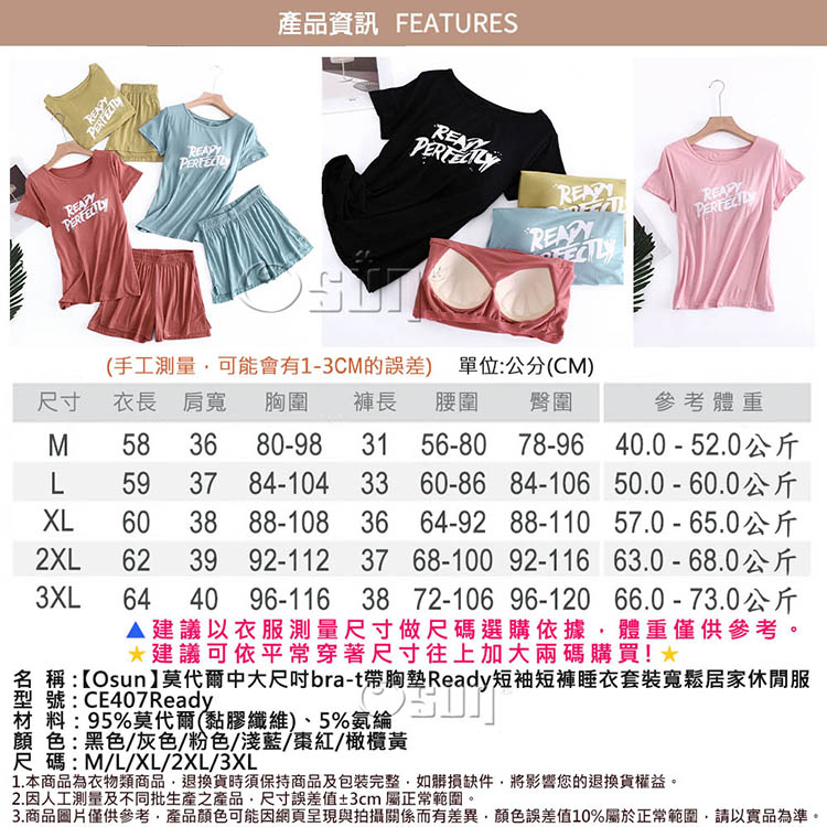 【Osun】莫代爾中大尺吋bra-t帶胸墊Ready短袖短褲睡衣套裝寬鬆居家休閒服(顏色任選/CE407Ready)