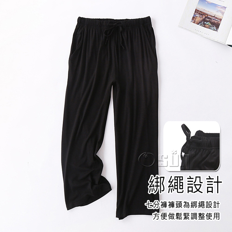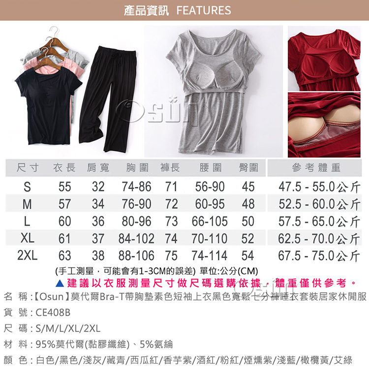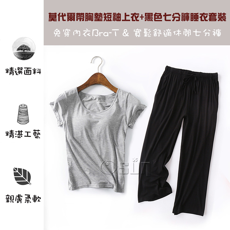 產品名稱:【Osun】莫代爾bra-t帶胸墊素色短袖上衣黑色寬鬆七分褲睡衣套裝居家休閒服