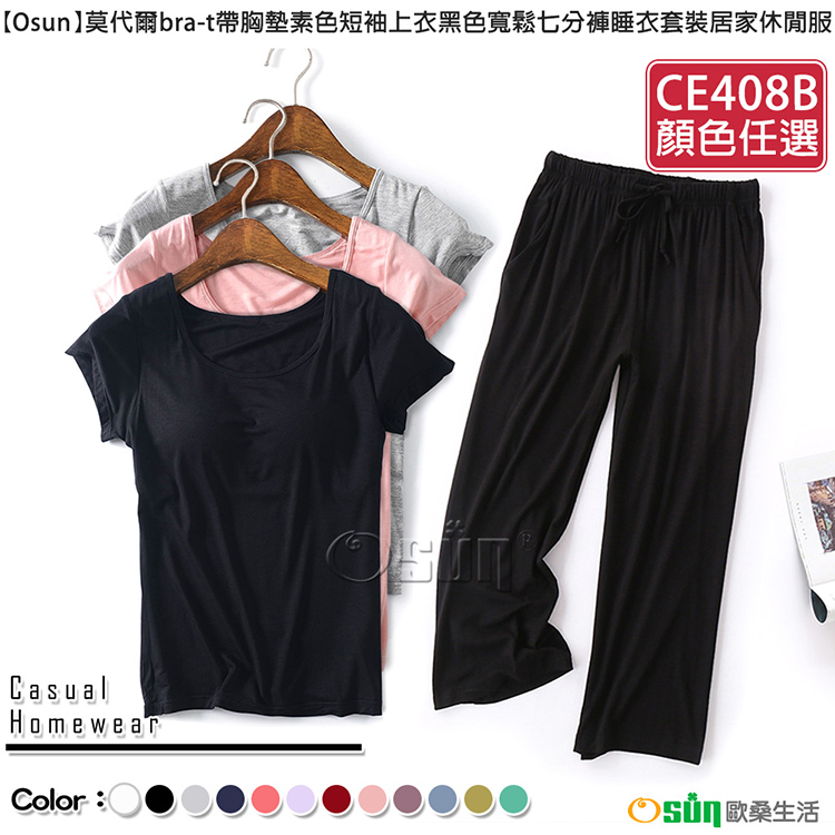 【Osun】莫代爾bra-t帶胸墊素色短袖上衣黑色寬鬆七分褲睡衣套裝居家休閒服(CE408B)