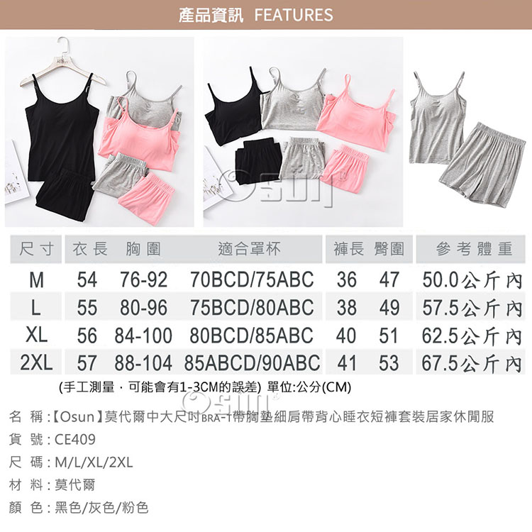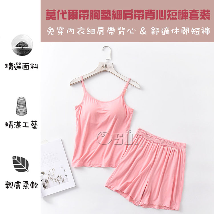 【Osun】莫代爾中大尺吋bra-t帶胸墊細肩帶背心睡衣短褲套裝居家休閒服(顏色任選/CE409)