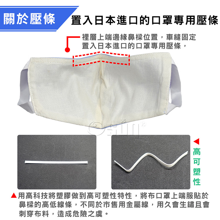 上端邊緣鼻樑位置,置入日本進口的口罩專用壓條,用高科技將塑膠做到高可塑性特性,此壓條能將此布口罩上端服貼於鼻樑的高低線條,不同於市售用金屬線,用久會生鏽且有刺穿布料,造成危險之虞。