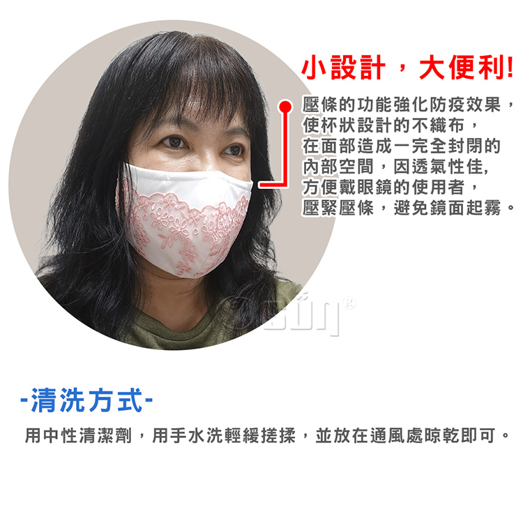 壓條的功能強化防疫效果,使杯狀設計的不織布,在面部造成一完全封閉的內部空間,因透氣性佳, 方便戴眼鏡的使用者,壓緊壓條,避免鏡面起霧。小設計,大便利。