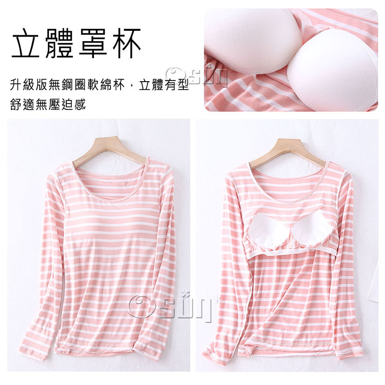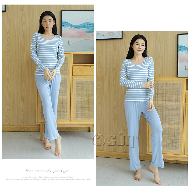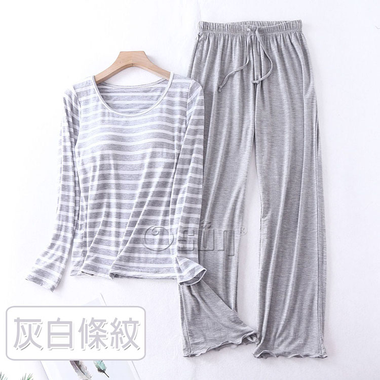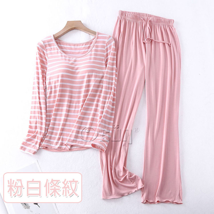 產品名稱:【Osun】Bra-T莫代爾帶胸墊條紋寬鬆長袖荷葉邊長褲套裝睡衣保暖居家服