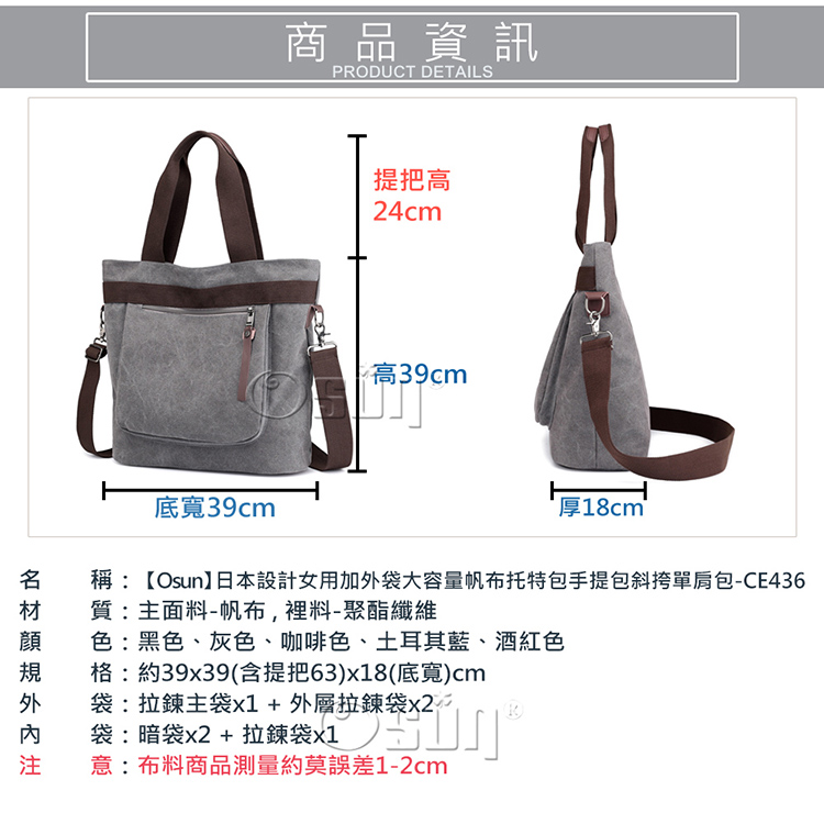 名稱:【Osun】日本設計女用加外袋大容量帆布托特包手提包斜挎單肩包(顏色任選/CE436)