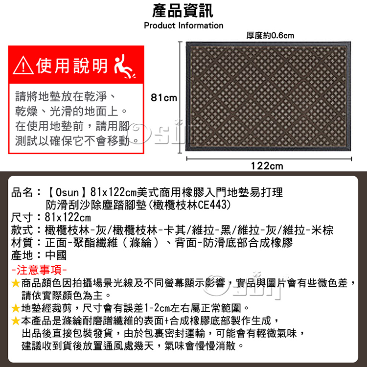 品名:【Osun】81x122cm美式商用橡膠入門地墊易打理防滑刮沙除塵踏腳墊(橄欖枝林CE443)