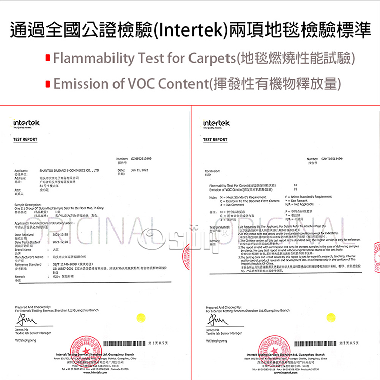 安心使用,本產品通過地毯燃燒性能試驗和揮發性有機物釋放量標準檢測。