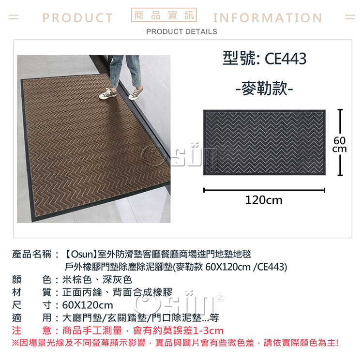 名稱:【Osun】室外防滑墊客廳餐廳商場進門地墊地毯戶外橡膠門墊除塵除泥腳墊(麥勒款 60X120cm /CE443)