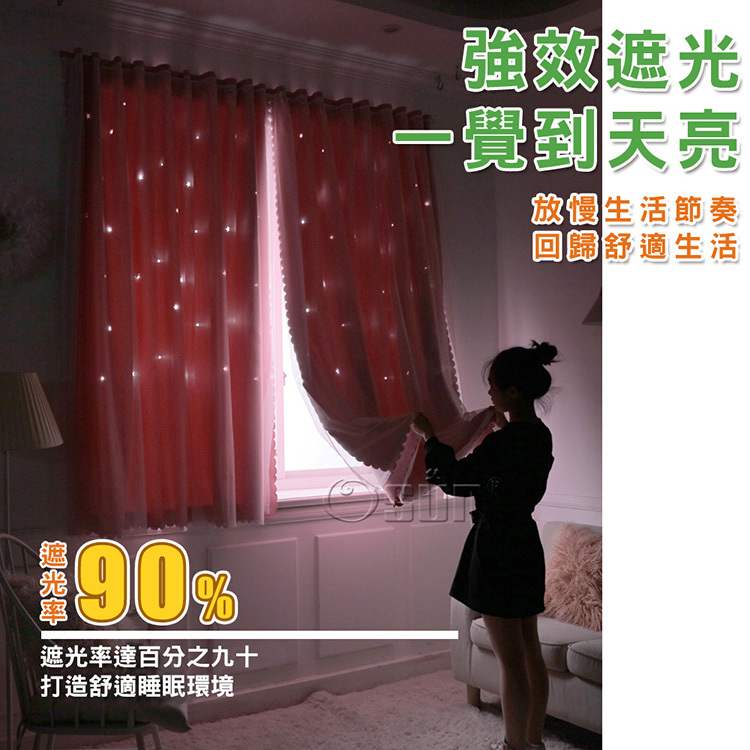 窗簾布面星星鏤空設計,搭配外側一層網紗,唯美透光