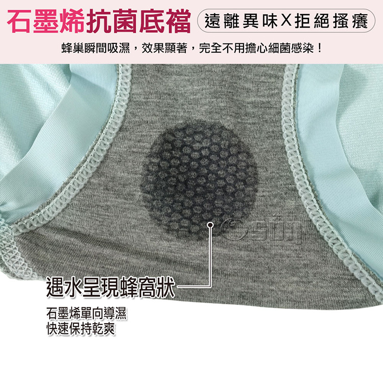襠部採用石墨烯複合抑菌技術,有效殺菌,遇水呈現蜂窩狀,單向導濕,快速排濕、讓您乾爽舒適一整天,時刻照顧到私密處健康!