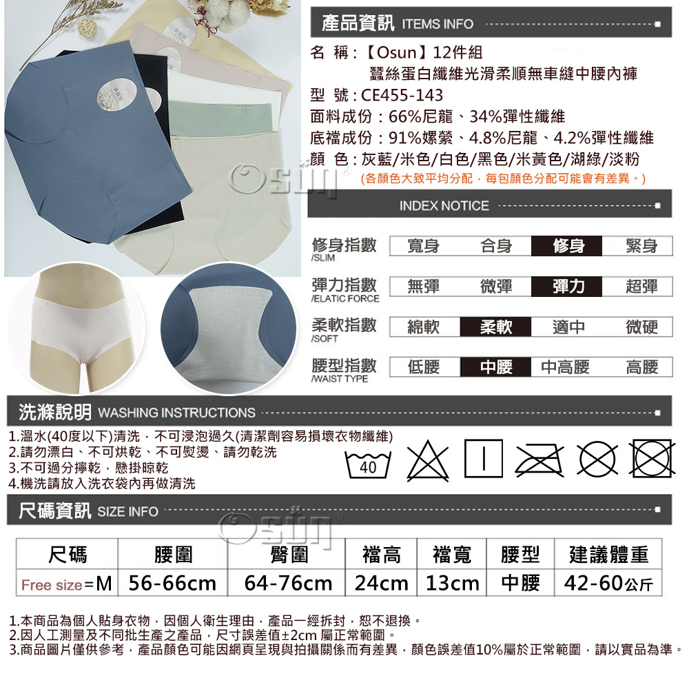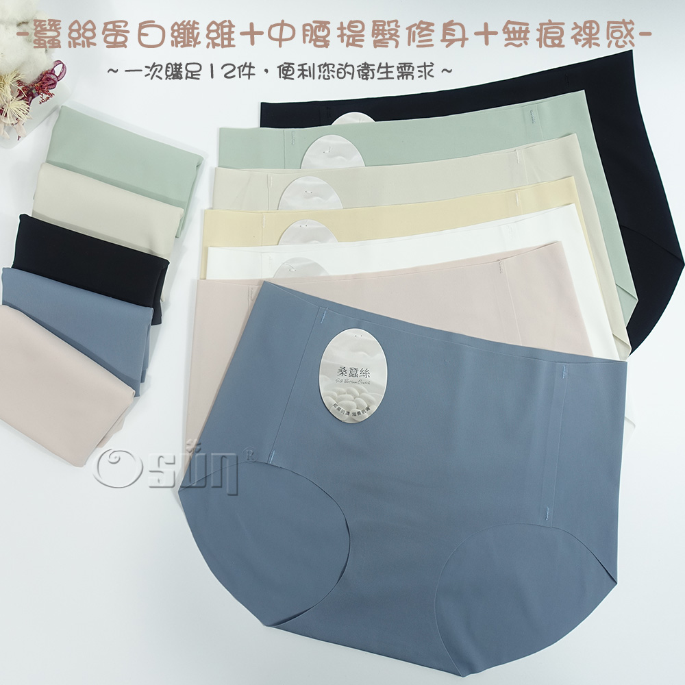 產品名稱:【Osun】12件組蠶絲蛋白纖維光滑柔順無車縫中腰內褲(CE455-143)