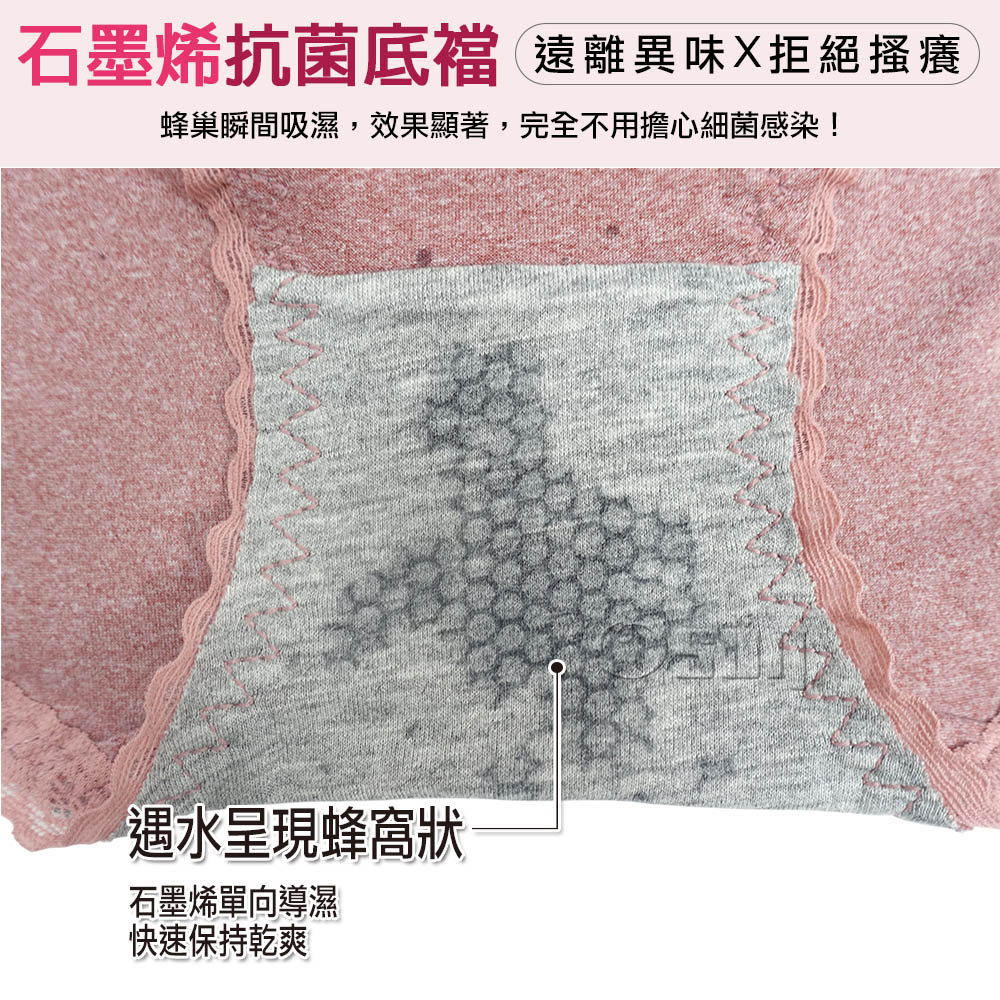 襠部採用石墨烯複合抑菌技術,有效殺菌,遇水呈現蜂窩狀,單向導濕,快速排濕、讓您乾爽舒適一整天,時刻照顧到私密處健康!