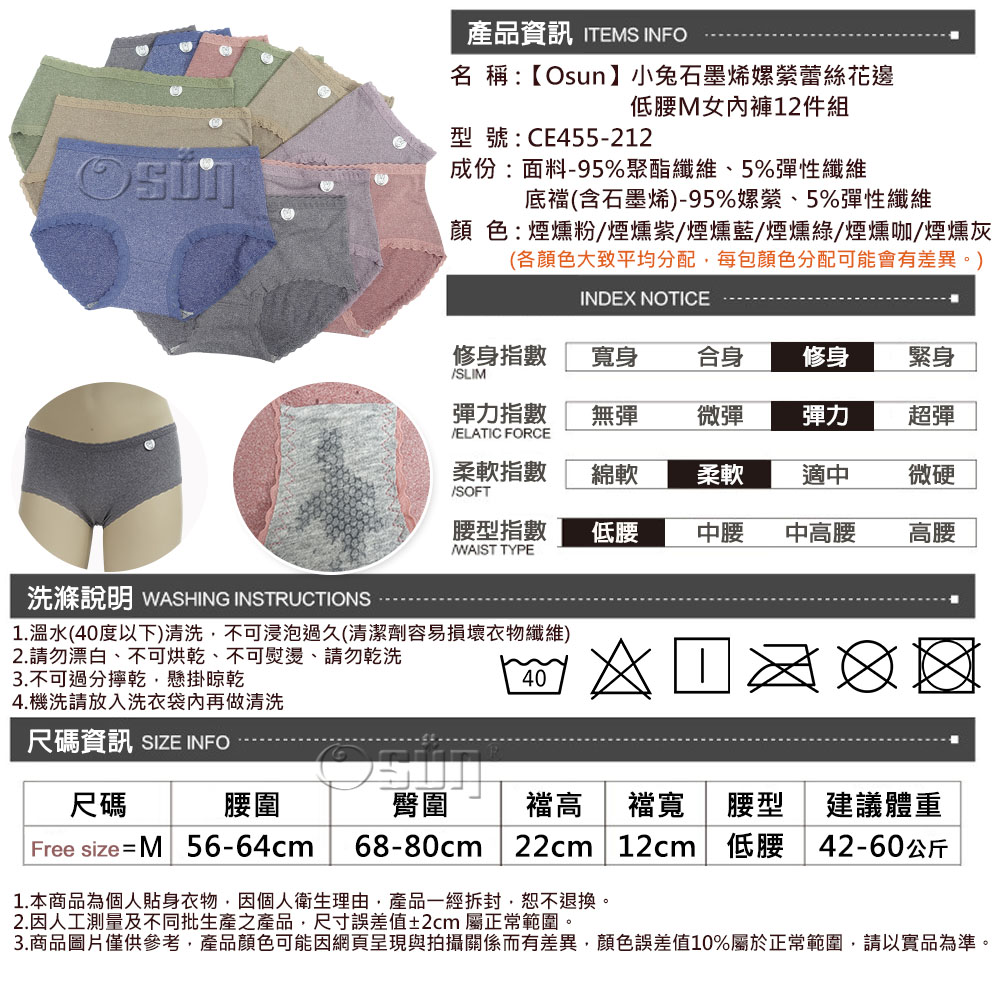 產品名稱:【Osun】小兔石墨烯嫘縈蕾絲花邊低腰親膚彈力M女內褲12件組 (CE455-212)