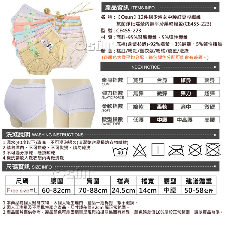 產品名稱:【Osun】12件組少淑女中腰紅豆杉纖維抗菌淨化嫘縈內褲平滑柔軟輕盈(CE455-223)