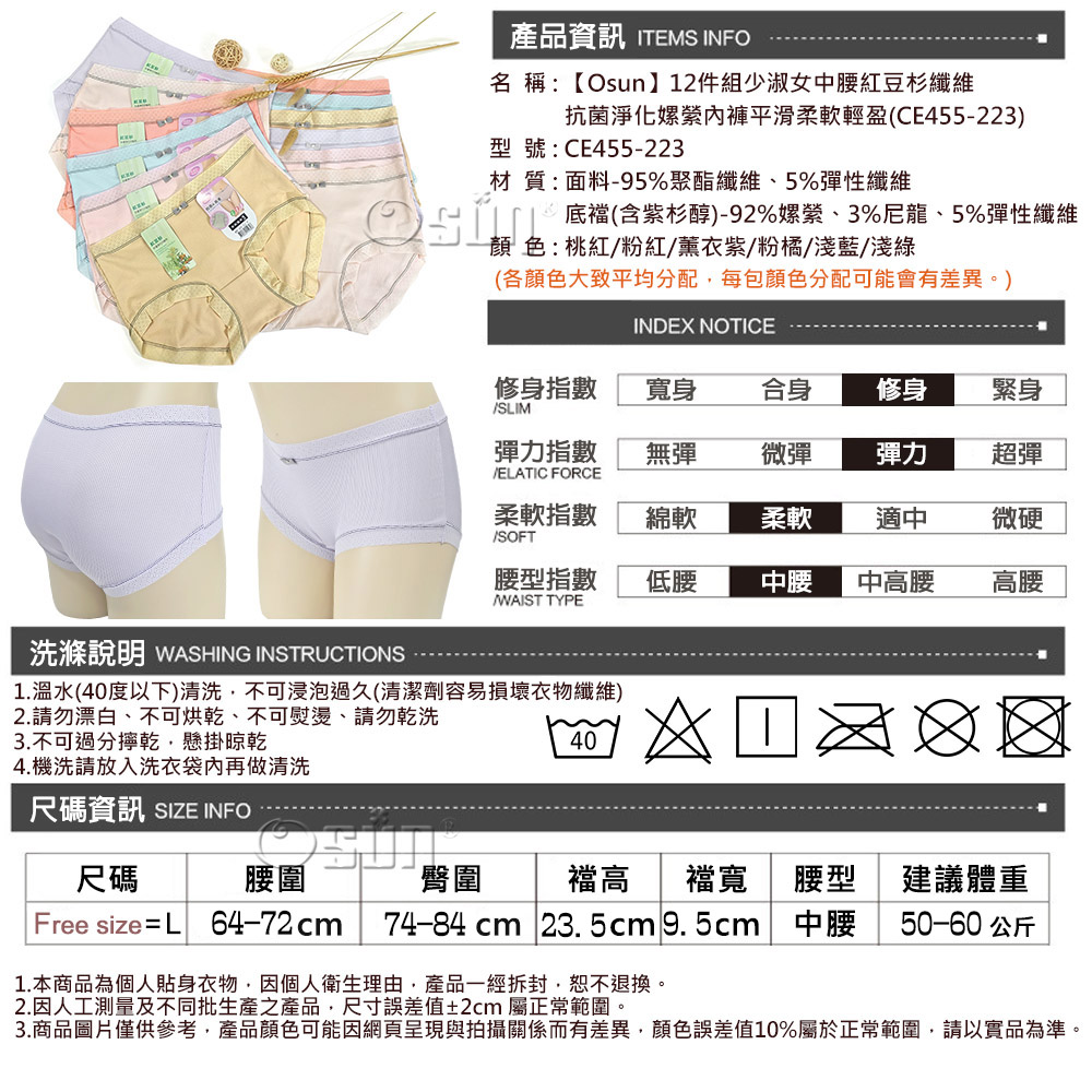 產品名稱:【Osun】12件組少淑女中腰紅豆杉纖維抗菌淨化嫘縈內褲平滑柔軟輕盈(CE455-223)