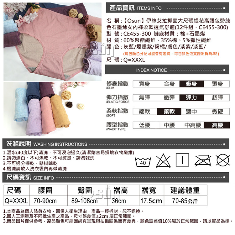 產品名稱:【Osun】伊絲艾拉抑菌大尺碼緹花高腰包臀純色石墨烯女內褲柔軟透氣舒適(12件組,CE455-300)