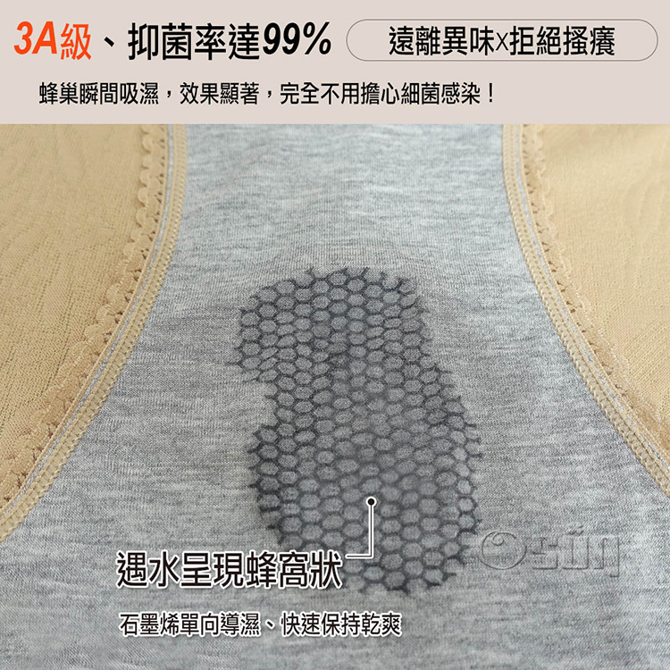 襠部採用石墨烯複合抑菌技術,遇水呈現蜂窩狀,單向導濕,快速排濕、讓您乾爽舒適一整天,時刻照顧到私密處健康!
