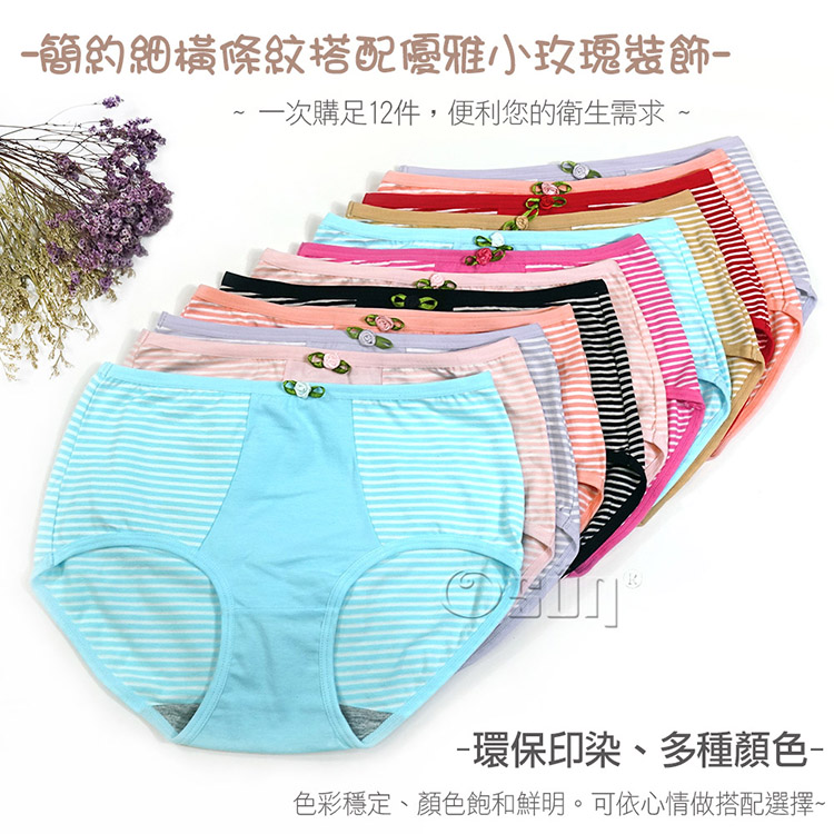 【Osun】12件組少淑女棉質三角內褲小玫瑰細橫條紋中高腰透氣舒適(CE455-445)