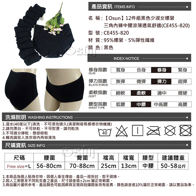產品名稱:【Osun】12件組黑色少淑女嫘縈三角內褲中腰涼薄透氣舒適(CE455-820)