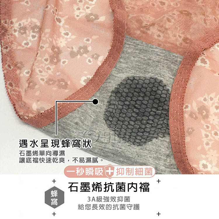 襠部採用石墨烯複合抑菌技術,有效殺菌,遇水呈現蜂窩狀,單向導濕,快速排濕、讓您乾爽舒適一整天,時刻照顧到私密處健康!