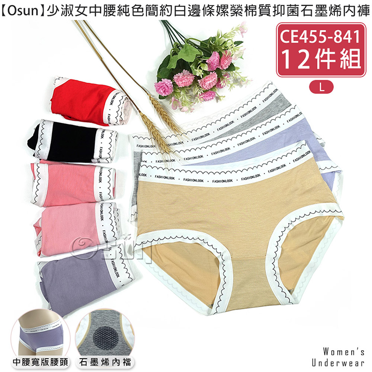 產品名稱:【Osun】12件組少淑女中腰純色簡約白邊條嫘縈棉質抑菌石墨烯內褲(CE455-841)