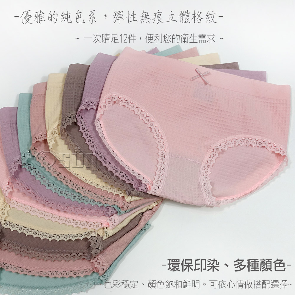 【Osun】12件組少淑女中腰彈性無痕一體成型三角內褲蝴蝶結立體格紋滾蕾絲 (CE455-8802)