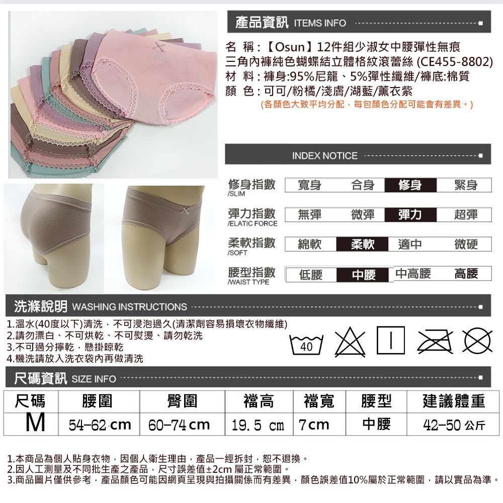 品名:【Osun】12件組少淑女中腰彈性無痕一體成型三角內褲蝴蝶結立體格紋滾蕾絲(CE455-8802)