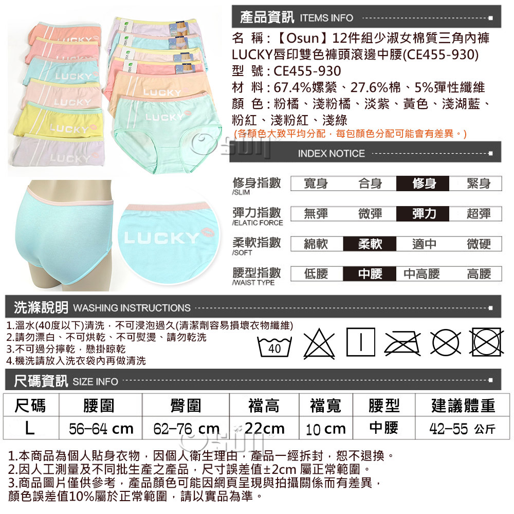 品名:【Osun】12件組少淑女棉質三角內褲LUCKY唇印雙色褲頭滾邊中腰(CE455-930)