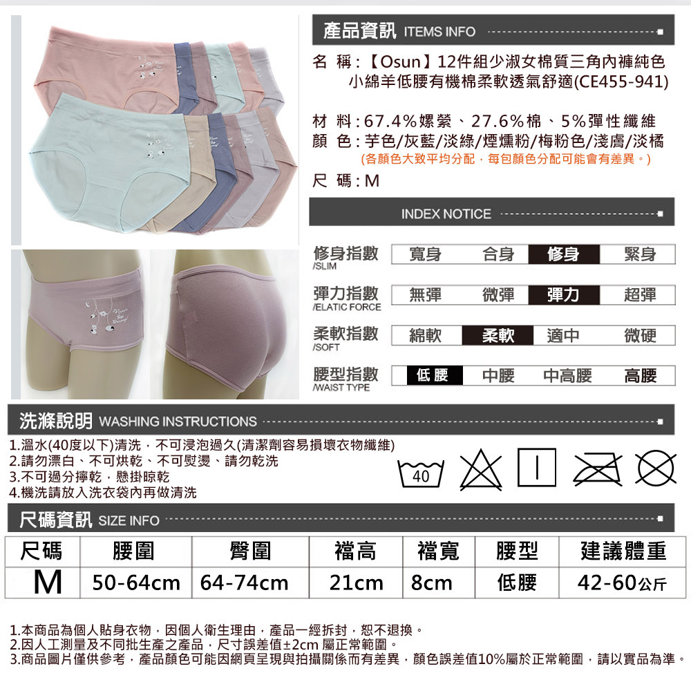 品名:【Osun】12件組少淑女棉質三角內褲純色小綿羊低腰有機棉柔軟透氣舒適(CE455-941)