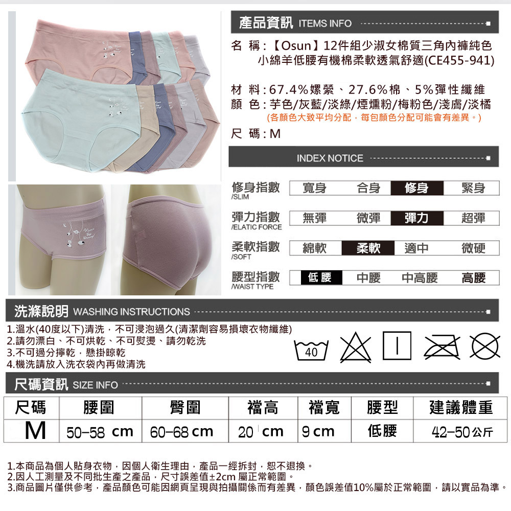 品名:【Osun】12件組少淑女棉質三角內褲純色小綿羊低腰有機棉柔軟透氣舒適(CE455-941)